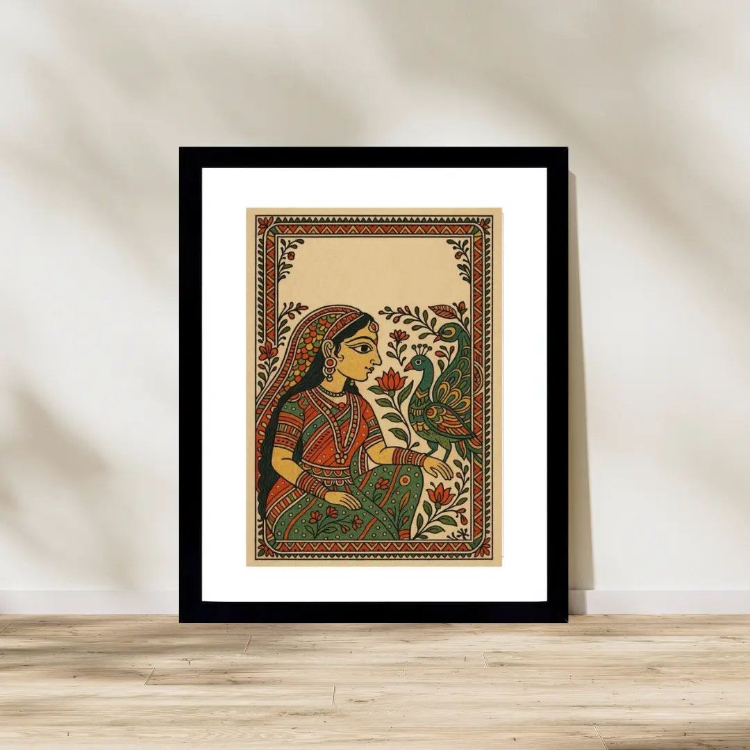 Framed illustration of Madhubani woman with peacock printed on 300gsm paper, 8×12 inch artwork, framed to 12×16 inches with fiber frame.
